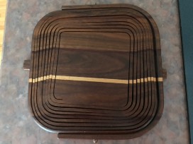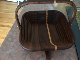 Unique collapsible wooden accordian wood basket bowl. It is 12" x 12" flat and when extended to a bowl shape it is 12" x 12" and 9 inches high with a 3 1/2 inch bowl at the bottom. Value: $75.00