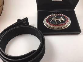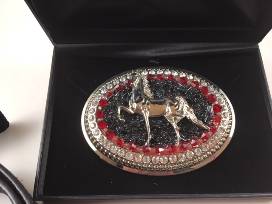 One of a kind silver saddlebred mounted on a field of black beads, surrounded by a ring of faceted transparent red beads. Deluxe rhinestone border buckle with rope edge. Great with jeans or as a western show buckle. 4 1/8" X 3 1/8". Fits belts up to 1 3/4". Includes 36" black belt strap. Value: $150