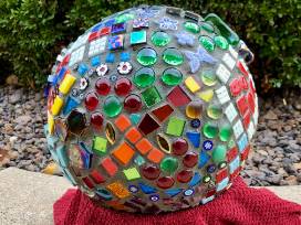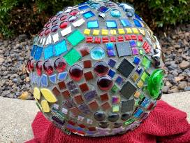 This upscaled gazing ball was created with the intention of making your garden look beautiful! This is an upcycled bowling ball that has been handmade using mosaic pieces and sealed with outdoor grout by SSL member Melissa Cunningham. Even though the grout is for outdoors we recommend storing it through the freezing temperatures. Enjoy the beauty!