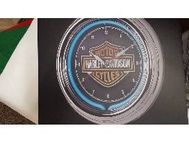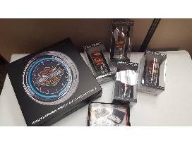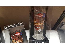 Harley-Davidson Neon Clock, a boxed set of Harley-Davidson double-six domino and a set of 4 - Eagle 16 oz. Pilsner Glasses, coasters and bottle openers.