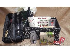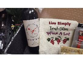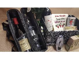 A zippered wine and glass carrier with one (1) 2010 Chronicle Pinot Noir from Healdsburg, CA, 2 wine glasses and a wine bottle opener. One (1) 2012 "One" Cabernet Sauvignon from Napa Valley. Napkins, mints, wine pourer with stopper, a wine preserving stopper and a wine tea towel