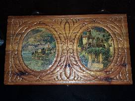 Beautiful Vintage Carved Wooden Jewelry Box with Mirror is adorned with 2 European country-side pictures. Include inside the jewelry box is 8 beautiful pieces of jewelry to include: 20" Silver Tone necklace by Premier Designs; Gray/Silver/Pearl Necklace with Bracelet; Jewelry Set - Earrings, Bracelet and Necklace (Amethyst like); Glass-type bracelet with green and gold tones; Silverworks earrings and necklace; Chico's Purple Bracelet; Premier Designs pearl and silver necklace with pearl earrings; and Post earrings - blue stone