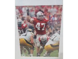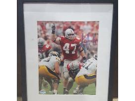 Linebacker, #47 AJ Hawk played for OSU from 2002 to 2005. Ohio State won the 2002 BCS National Championship with Hawk as a freshman. During his four-year Buckeye career, he played in 51 games, starting 38 of them. This signed photograph is matted and framed and contains an authentication from Cheroes.com.