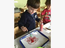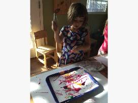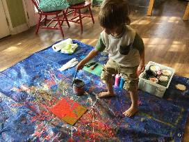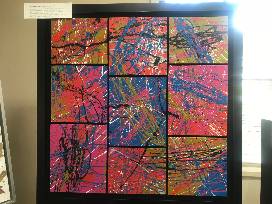 The Sequoia class was inspired by the works of Jackson Pollock for their gala piece. Each student had the opportunity to experiment with different paint types, tools, and ways to splash the paint onto a canvas. Each of the nine panels was created collaboratively by the children to construct a cohesive piece. This vibrant and bright artwork embraces the children's love for color, creativity, collaboration, and self expression.
