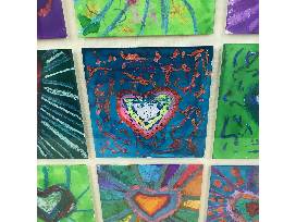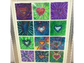 The 1st Grade "Art Hearts" pieces were all inspired by the same heart that each student used to trace. Then, using oil pastels, each child filled in their own heart in whatever colors they wished. After the coloring was completed, they then painted over the hearts with water color using a technique called "Water Color Resist." The hearts then come together in a show of love for Gillispie!