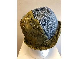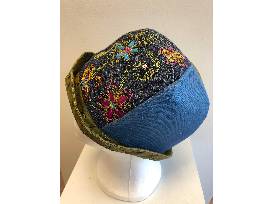 Hat of primarily blue and green with stitched on daisies & some with stone petals.
