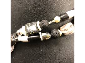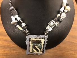 1A black & white pendant made of wearable art from the palette hung on a chain of beads varied in shape and size.