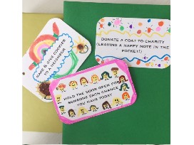 Ms. Jentges' 2nd grade class created a rustic Advent calendar ladder to countdown the days to Jesus' birthday! Galvanized pails to hold surprises or treats. Each day features act of goodwill to spread the joy of the season.