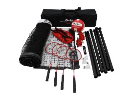 Pieces Included: Volleyball, net, 4 raquets, webbing boundary line, 2 regulation height posts, 2 double braided ropes with heavy duty adjusters, 4 nylon stakes, 4 shuttlesocks, ball pump, storage bag, set of rules