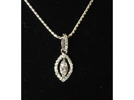 The PENDANT has a center marquise cut diamond (0.26) that is surrounded with 27 round brilliant cut diamonds (0.23) and hangs from an 18" white gold wheat chain.