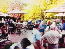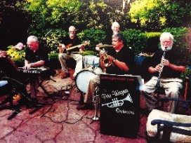Cocktails outside in garden by waterfall with music by Pete Wagner orchestra