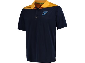 This item includes an Officially Licensed, Men's St. Louis Blues Reebok Dark Blue/Gold Center Ice Statement Polo in size (L). The Speedwick technology dissipates sweat to keep skin dry and comfortable. The polo has side slits and a 3-button placket. The "Blues" insignia is an embroidered fabric appliqué.