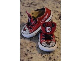 Bridget Schuster is offering one pair of Disney Converse Infant/Toddler shoes decorated with Swarovski crystals up to T10; OR one pair of Child through Adult shoes custom designed just for you! The Infant/Toddler converse tennis shoes come in red, white and Pink. The Child/Adult Converse shoes come in a variety of colors.