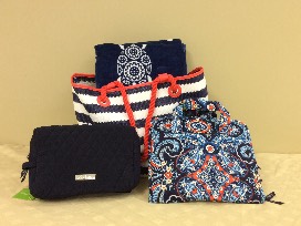 Vera Bradley striped Tote, Vera Bradle Beach towel with turtles, Vera Bradley navy cosmetics bag, Vera Bradley hanging organizer