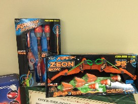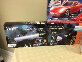 Vivatar refractor telescope and microscope, squishy sand, playmobil Porsche set, over the door basketball hoop, zehn bow and firetek rocket