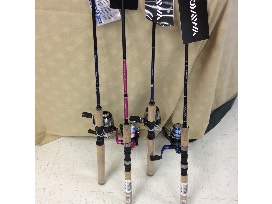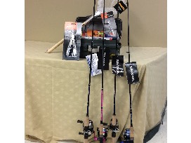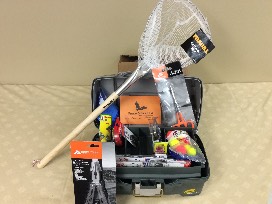Fishing poles, tackle box, misc lures, multi tool, net and gift card toward family fishing license for 2018