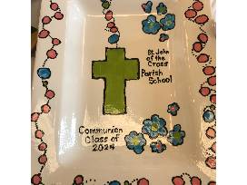 A Color Me Mine Chalice/Plate commemorate this special sacramental year. Celebrate your child's first communion with this masterpiece with participation from the entire 2nd grade! Each of the 2nd grade students contributed their unique thumbprint to make a special keepsake for your family to enjoy. What a wonderful accent to give your home a little "SJC" for years to come!
