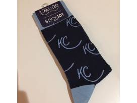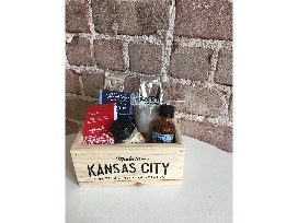 A basket filled with KC originals including The Roasterie coffee, Jack Stack BBQ rub, Gates BBQ sauce, Andre's milk chocolate almonds, Sock101 KC socks, and a KC mug.