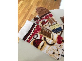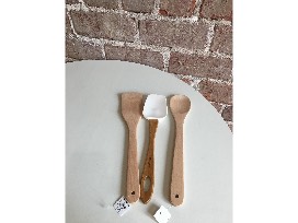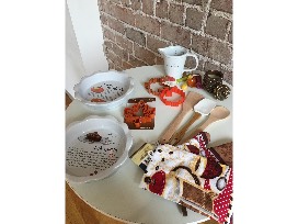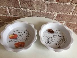 This includes an oven mitt, kitchen towel, Hallmark cookie shapers (leaves, turkey), round wooden spoon, spatula, square wooden utensil, Autumn measuring spoons, 2-cup ceramic measuring cup, ceramic pie plate - pumpkin pie; ceramic pie plant - pecan pie and a Hallmark pine cone candle.