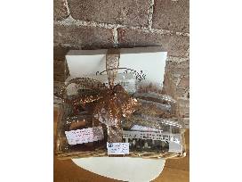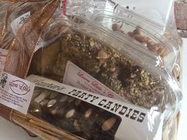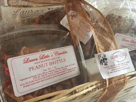 A large basket from Laura Little's filled with assorted peanut brittle, butter almond toffee, cashew brittle, party candies, pecan clusters, nuts, assorted fudge.