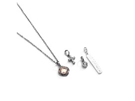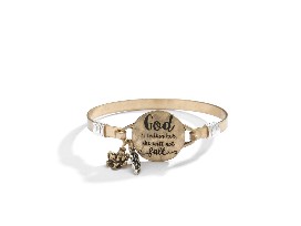 A silver necklace with interchangeable charms and a gold "God is within her she will not fail" bracelet.