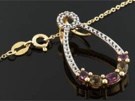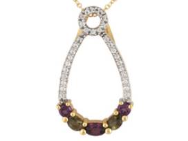 24ctw oval green moldavite, with .25ct oval purple rhodolite, .26ctw round purple rhodolite, and .20ctw round white topaz, 18k yellow gold over sterling silver pendant/slide with chain. Spring ring clasp. Necklace from jtv.com.