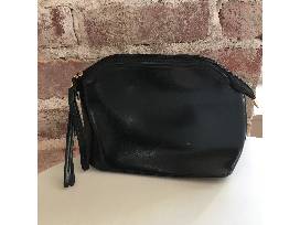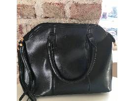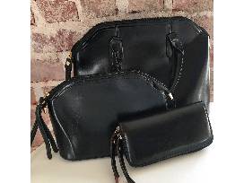 A black leather tote, a black leather clutch (with a detachable strap) and a black leather wallet.