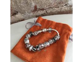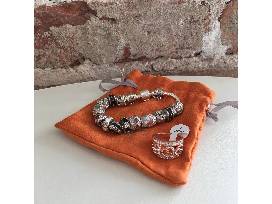A silver bracelet with multi colored charms and a light pink hearts ring.