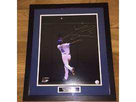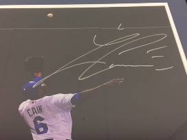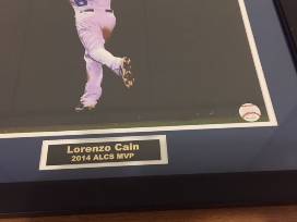 A framed and autographed Lorenzo Cain 2014 ALCS MVP photo.