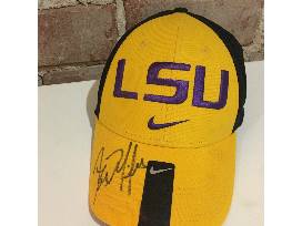 A yellow and black LSU hat signed by former LSU coach, Les Miles.