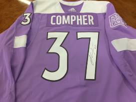 JT Compher lavender jersey issued on November 2, 2017 in honor of Hockey Fights Cancer. Jersey will be autographed by JT Compher. Size 56. Sales tax will be added to your final bid and shipping charges may apply. If a bid is placed in the final 30 seconds of the auction, the close time will extend another 30 seconds until no bids have been placed in that timeframe.