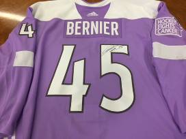 Jonathan Bernier lavender jersey worn during pre-game on November 2, 2017 in honor of Hockey Fights Cancer. Jersey will be autographed by Jonathan Bernier. Size 60G. Sales tax will be added to your final bid and shipping charges may apply. If a bid is placed in the final 30 seconds of the auction, the close time will extend another 30 seconds until no bids have been placed in that timeframe.