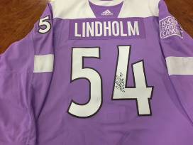 Anton Lindholm lavender jersey worn during pre-game on November 2, 2017 in honor of Hockey Fights Cancer. Jersey will be autographed by Anton Lindholm. Size 56. Sales tax will be added to your final bid and shipping charges may apply. If a bid is placed in the final 30 seconds of the auction, the close time will extend another 30 seconds until no bids have been placed in that timeframe.
