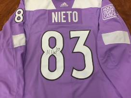 Matt Nieto lavender jersey worn during pre-game on November 2, 2017 in honor of Hockey Fights Cancer. Jersey will be autographed by Matt Nieto. Size 56. Sales tax will be added to your final bid and shipping charges may apply. If a bid is placed in the final 30 seconds of the auction, the close time will extend another 30 seconds until no bids have been placed in that timeframe.