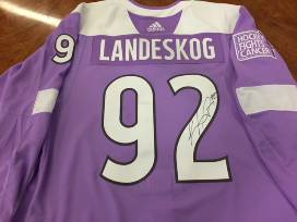 Gabriel Landeskog "C" lavender jersey worn during pre-game on November 2, 2017 in honor of Hockey Fights Cancer. Jersey will be autographed by Gabriel Landeskog. Size 58. Sales tax will be added to your final bid and shipping charges may apply. If a bid is placed in the final 30 seconds of the auction, the close time will extend another 30 seconds until no bids have been placed in that timeframe.