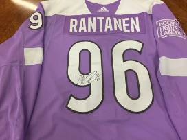 Mikko Rantanen lavender jersey worn during pre-game on November 2, 2017 in honor of Hockey Fights Cancer. Jersey will be autographed by Mikko Rantanen. Size 58. Sales tax will be added to your final bid and shipping charges may apply. If a bid is placed in the final 30 seconds of the auction, the close time will extend another 30 seconds until no bids have been placed in that timeframe.