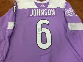 Erik Johnson "A" lavender jersey worn during pre-game on November 2, 2017 in honor of Hockey Fights Cancer. Jersey will be autographed by Erik Johnson. Size 58. Sales tax will be added to your final bid and shipping charges may apply. If a bid is placed in the final 30 seconds of the auction, the close time will extend another 30 seconds until no bids have been placed in that timeframe.