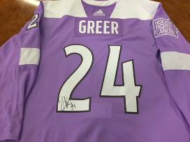 AJ Greer lavender jersey worn during pre-game on November 2, 2017 in honor of Hockey Fights Cancer. Jersey will be autographed by AJ Greer. Size 58. Sales tax will be added to your final bid and shipping charges may apply. If a bid is placed in the final 30 seconds of the auction, the close time will extend another 30 seconds until no bids have been placed in that timeframe.