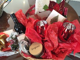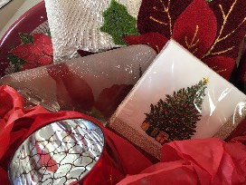 Includes poinsettia cheese board and knife, table runner, holiday candle, wine stopper, holiday cocktail napkins, festive wine glasses, and a poinsettia serving tray. Also includes two bottles of wine and Guylian Belgian chocolates.