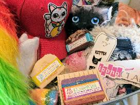 For the ultimate cat lover, these iconoclad threads will have you covered from head to toe in kitty! There is a fleece-lined snow hat, space cat leggings, wide-eyed hi-lo cat tank, Maneki-neko trucker hat, cat socks and even a rainbow cat tail. There is even a little bowtie for your favorite cat to join in the fun. When you pair these cool cat threads with a fabulous basket from Purring Buddha you will be the happiest cat lady around. There is a variety of bath bombs, body scrubs and 3 handmade soap creations along with a soap dish.