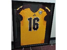 This authentic framed CMU gold jersey is signed by CMU Football Head Coach, John Bonamego.