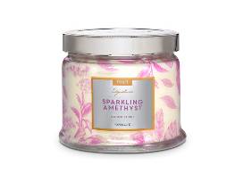 An assortment of Party Lite candles. A Sparkling Amethyst Candle, a Mountain Laurel Candle, and a Pedestal Candle Stand.