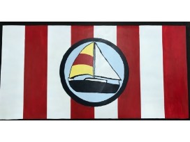 This hand painted floor mat was created by HCP student artists, Lilly VanSweden and Krystina Kasson. Sailboat. It features a nautical theme - red and white stripes with sailboat.