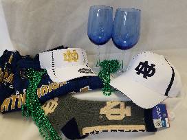 The ultimate Notre Dame package! This certificate entitles the bearer to a 2018 gold membership to the Notre Club of Kalamazoo, inclusion in activities, access to the club's "Ticket Lottery" with chances to win 2 tickets for a football game. Also includes Notre Dame wine, 2 stem glasses, pajama pants (large), embroidered T (large), baseball cap, visor, socks, and t-shirt (xxl).