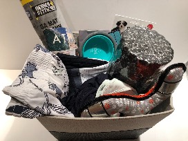 Items included in basket: sports bra, Sunlover tank, Foothills tank, Contender tight and racer, three dog accessories, yoga mat and foam roller.
