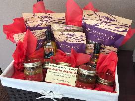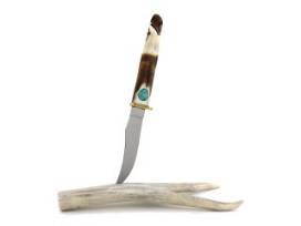 This antler bone knife handcrafted by Choctaw artist Paul Hackard is accompanied by a Choctaw Farms gift basket filled with with pecans, jellies, and more!