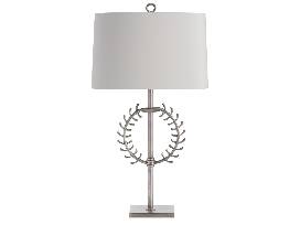 Designed by Windsor Smith for Arteriors, this pair of vintage silver table lamps take a simplified interpretation of the classic Greek laurel wreath and pairs it with a thoroughly modern soft cloud gray shade to create the perfect balance between old and new. Lamps measure: 31" H x 18" W x 10" D.