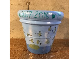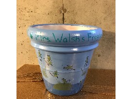 This large clay pot was hand-painted by Mrs. Walsh's room mom, Mrs. Margie McEneny, and decorated with Mrs. Walsh's "frogtastic" students' thumbprints. This pot can hold a 5-10 gallon potted plant.