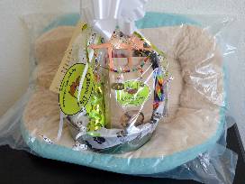 You've been gone all night, so spoil her with this basket of goodies. Basket includes a dog bowl, treats, socks, a Kong, ornament, toy, ball, poop bags, and a gift certificate for a self-serve dog wash, along with a new bed.