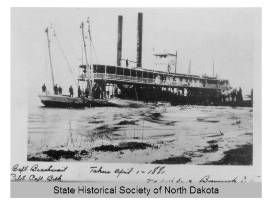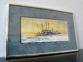 This framed and matted 1987 watercolor by Heinbaugh was inspired by a photo at the State Historical Society of North Dakota. It features the steamboat Eclipse loading passengers in Bismarck, North Dakota. The Eclipse, a sternwheel packet with a wood hull, was built in California, Pa., in 1878. In all she made 11 trips to Fort Benton between 1878-1887. She was the flagship of a fleet of steamboats in 1881 carrying several thousand Native Americans from the Yellowstone to agencies in the Dakotas. Last owned by Montana Transportation Co., Capt. Isaac P. Baker, master. She was fatally snagged 15 miles below Sioux City, Iowa, on Sept. 3, 1887. Frame measures 16.5" x 10.5".